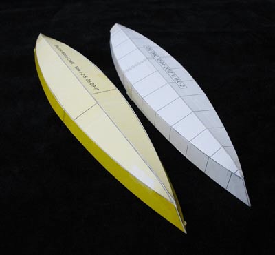 It took me two model hulls to come up with the final design of the scaled down 14ft version that I liked. I actually had the finished model on the first try, but I wanted to change the shape of the transom, so the second model was made. The two halves of this hull, like the 14 foot version, fit on one scarfed sheet of plywood cut down the middle into two equal widths. The shorter 12 foot EMC has almost the same width of the two bottom, and side panels as the 14 footer, but when the hull is wired up, comes in with a narrower beam at 32 inches. I wanted this hull to have the same amount of stability that the bigger version has, and I kept the width of the original bottom panels.
