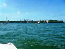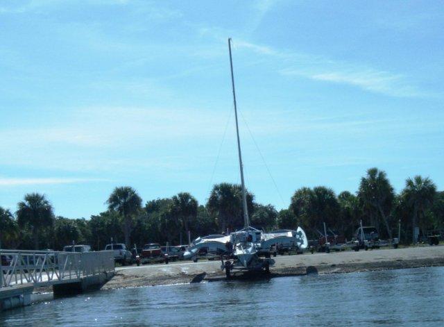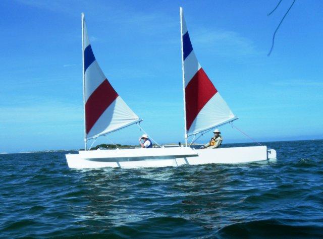 We had so much fun sailing at Ft DeSoto two weeks ago that we did it again and after hearing how great this place is some new boats came along. You can tell from these pictures why this area has been named one of the best beaches in the country. I'll comment on a couple of these; Franks big tri performed well but us mono guys still think it's just a skinny boat with training wheels. Michael had a new little boat he said was a skerry, I think. It was pretty but a little slow for him and it rolled him out into the water during a jibe and the big boat wakes.