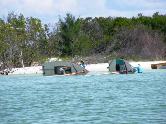 Crazy Steve had his tiny ketch wound up and moving right along. He answered the question once and for all; What's the fastest sailboat in the world for going to weather with absolutely no wind and no oars? These two melonseeds are laying on their sides to get their centerboards unstuck. The beach was not sand but crushed shell that really jammed up our boards. Since they float on their sides we just pulled them over, popped the plug on top of the cap and pushed them down with the stick made for just this.