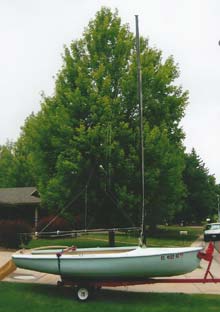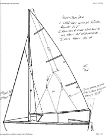 Raven suggested that I provide myself with a very small, high-clewed storm jib, to be flown on its own separate halliard, underneath, or behind the regular jib halliard, independent of the head-stay. What a good idea that was! I had bought an old jib from a sailboat dealer locally and it was large enough to cut the little jib out of it. I sent this along to Doyle with a drawing showing the dimensions that I wanted the new jib to have. I had determined the dimensions using the Lido 14 sail-plan drawing available on the internet. I read somewhere that a line drawn from jib sheet cleat fair-lead to the headstay, thru the clew of the jib, should intersect the head-stay at a point that is above the tack a distance equal to 40% on the length of the luff. I lengthened the leach by a couple of inches over the calculated length so that any required adjustment could be, hopefully, accomplished by raising the little jib's tack on an extension. In addition to the main sail and the material from which Doyle would make the new storm jib, I sent the regular jib, which needed piston-type hanks installed to replace the plastic, twist-on-type that were on it. RAVEN suggested installing a down-haul on the big jib so that it could be hauled down onto the deck from the cockpit and there would be no necessity of going on the foredeck, a good thing not to have to do on a small boat when it's blowing. The piston-type hanks would prevent the jib from detaching itself from the head-stay, which the snap-on fittings might allow.