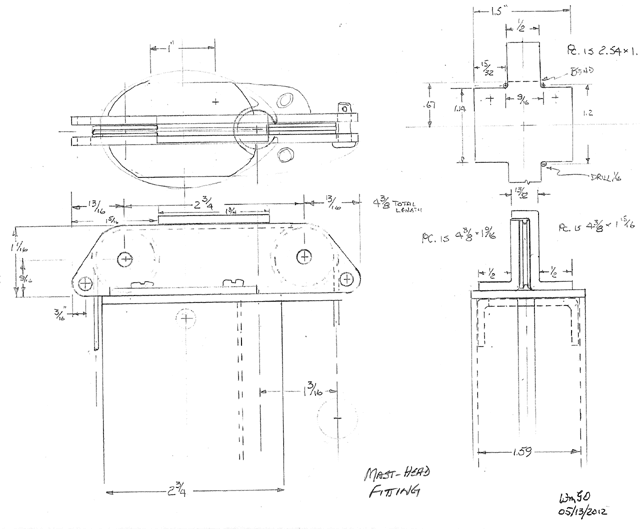The mast-head fitting, early on, demonstrated the familiar (to Lido sailers) high friction of the wire halliard against the stainless steel tube that arches over the top of the mast, which caused "stranding" of the main halliard. The mast-head fitting and the wire halliards had to be replaced. I made a double-sheave fitting for the main halliard at the mast head and installed it using the one hole already existing in the mast. (I tried NOT to drill any holes in my borrowed boat.) When it came to make new composite halliards, I elected to install ferrules in loops at the wire ends, using Nico-Press-like fittings that I made on my 65 year old Kalamazoo machinist's lathe. The braided part of the halliard I lashed into eyes thru the wire loops. Years ago, I had made braid-to-wire splices in the halliards of my Rhodes 19 and on those very small wires and braid I remembered that it wasn't easy so I took the easy way out this time.