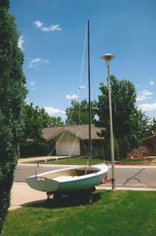 I found a very old Lido 14 (number 1533) advertised for what I perceived as a very high price, considering the condition of the boat, but the owner is a tolerant and patient young man, who, when I offered him one sixth of his asking price had the good sense to "keep his cool" while demurring and contact between us continued, sporadically, over a couple of months. Finally, in March, I offered him a sum of money to allow me to use the boat while he retained ownership. I would improve the condition of the boat and when I returned from Texas, he could examine the boat and if he wanted to sell it on his own, he would return my money. If he didn't think he could get more for the boat than I had given him he would sign it over to me and no further payment would be called for. We signed a contract. I could tell neighbors that the boat was borrowed and that it would be gone before the summer was over. I fastened a hitch ball to the street light standard in my front yard so the boat/trailer would stand perfectly still while work advanced.