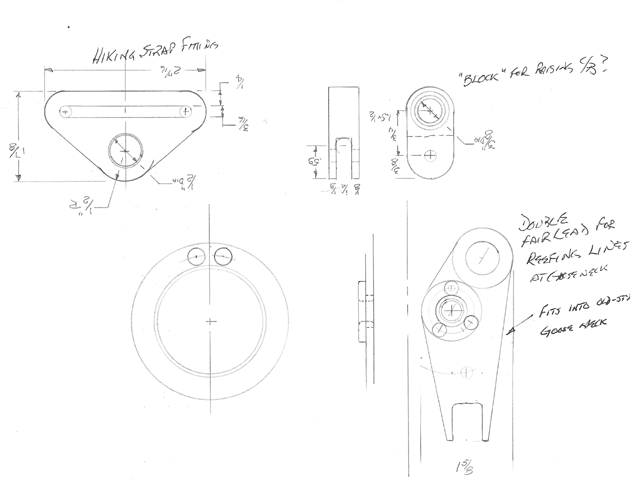 Slab-reefing, which I was preparing for, requires fittings on the boom to which the reefing lines are dead-ended and which re-direct the reefing lines along the boom toward the mast. These were made as two-bolt clamps, fashioned out of polyethylene with Delryn sheaves. Because the Lido boom is round, these clamps are quite simple and they permit forward and aft adjustment along the boom so that the tension in the "foot" of the reefed sail can be properly established. Just behind the mast, mounted on the goose-neck, I made a bracket in which there are two fair-leads to direct the reefing lines upward to the reef cringles in the luff of the main.