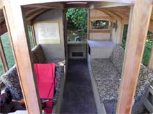 With an "isle, 28" wide, running the length and exiting to front and rear decks she can now travel the length of the boat. Two, 62" wide, couches facing each other, are great for sitting. With stadium chairs set on the ends we even have Captain's chairs (two, as I am not fully in charge!). Beds are arranged in several ways; 1) two can sleep on the couches as you would at home, 2) place fillers between the couches and the cushions will drop to create a queen sized bed, 62" X 82", 3) two more can place sleeping bags in the 14' isle, 4) I also plan to tent in the front deck creating sleeping for two like a pop out camper does, and 5) I've seen bunks made from army stretchers that could be hung inside if someone wants a hunt camp on the water. We will sleep no more than four and add a tent on shore if we have more.