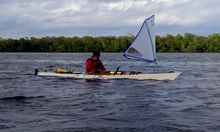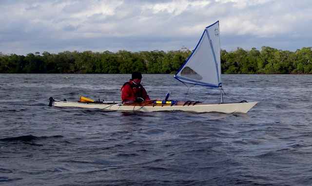 On to Estero and Fort Myers Beach. I had never been that way before and it made for an interesting trip. Seaward, nothing is visible but a line of high rise condos. But on the inland side, at least at the start, is a mix of marina, restaurants, bars, mom-and-pop motels, and the like. And those folks like their boats. Aside from the marinas, there are boats moored everywhere. Once in from the Gulf, we re-raised the reefed main and followed the well-marked waterway and eventually found ourselves in company with Justin Blais (Frenchman) in is class 1 (downwind sail only) kayak. He was heading to Wiggins Pass, a few miles past New Pass and also obtainable without going into the open Gulf.