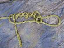 This variation of the Death Grip Hitch (aka DGH) came about from an email sent via Chuck at Duckworks, for a request from a Boy Scout Leader in New Jersey a year or so ago.  He had seen my video of tying the DGH on YouTube, and had been teaching it to other leaders, and to their troops at various scouting camps and meetings.  He told me they had been using the scouting taut-line hitch for tents, tarps, and other scout uses, but that it tended to slip over time.  He was impressed with the holding power of the DGH, and wondered if that knot could be made into something like the taut-line hitch.  Hummmm?  I emailed him back that I thought I had made such a beast once when I was developing the DGH, but I wasn't sure if I had or knot.  Age has a way of making things seem like they are possible, but I told him I would see if it was possible that tying the loop could be done.