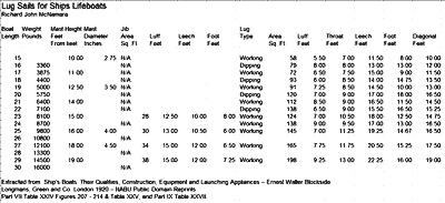 Ernest Walter Blockside authored "Ships' Boats: Their Qualities, Construction, Equipment, and Launching Appliances" in London in 1920. He describes the construction and outfitting of lifeboats. My googling lead me to this book, and I purchased a Nabu Public Domain Reprint. The information in the table is a compilation from 3 Tables and 8 Figures on 7 separate pages. I had to convert hundredweights and calculate a couple of dimensions that were missing from the figures. In doing so I discovered that the Working (Standing) Lug drawings in Figures 209 and 210 are transposed. In order to check the dimensions I used this Sail Area Calculator.