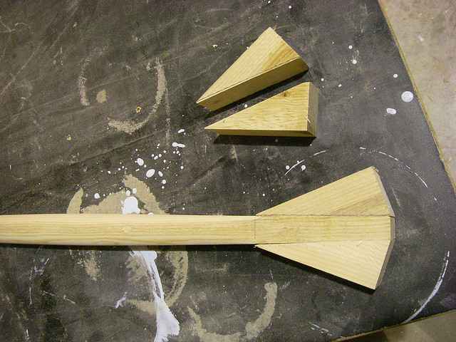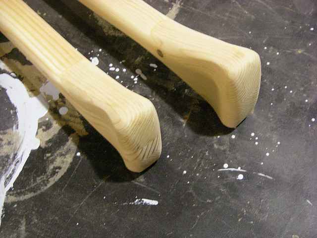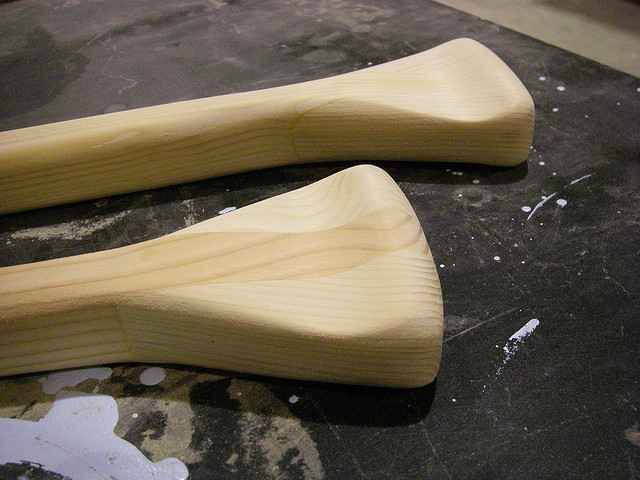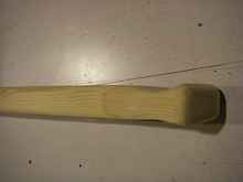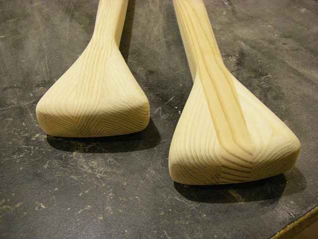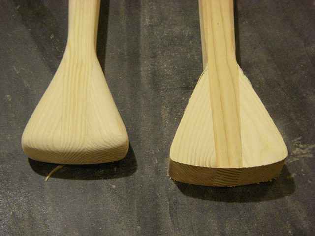 The near end is the blade end. It has been shaped to receive the plywood blades. The far end is the handle end. It is left square to receive the wedges (ears) that will fill out the full grip shape.