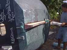 I turned the boat over in the reef and found that the hatches which were of the press fit type, promptly blew off from the hull compression, allowing the boat to completely flood. Fortunately trapped air kept her afloat. Her type of construction enabled me to repair her within the week and I have subsequently installed threaded locking hatches.