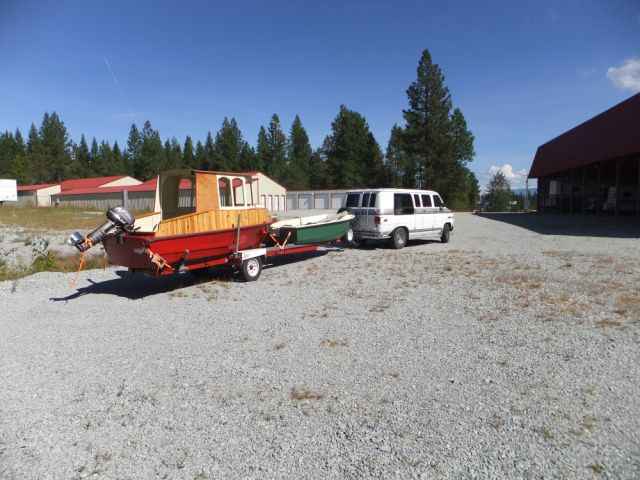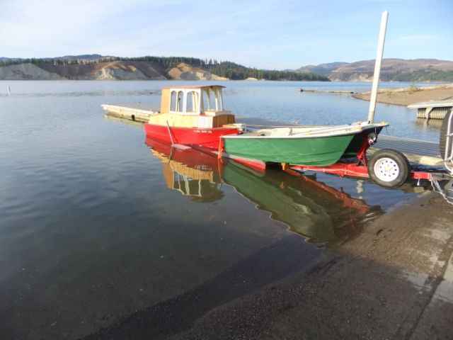 Hunters has a real nice Park Service campground and launch ramp. As I found my way down to the ramp, there was this white SUV with lights and antennae sprouting from the roof following me rather closely. When I pulled up to get ready to launch, these two park rangers stopped and offered the almost-routine "Say, that's a really cool little tug boat ya' got there." For a rather crudely built, and hastily thrown together little spit kit, Shenanigan really turns heads, as they say in the Craigslist ads. In fact, as I was coming out of the store back in Hunters, a school bus passed and every kid had their nose pressed to the window and was pointing at little Shenanigan. It seems to happen all the time. This trip, I was pulled over by the side of a farm road and was checking the tie downs, trailer lights, and all that sort of stuff. A guy in a pickup came screeching to a stop and jammed his rig in reverse, and backed up for a second look. There we were (me standing) in the middle of the road talking about boats. A horse pasture on one side, a wheat field on the other. Seems to be a great way to meet people.