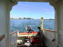 I think there were four other truck and trailer rigs in the launch area parking lot. In the summer months, this place probably looks like Wal-Mart on Christmas Eve. I backed in and had Shenanigan floating, and underway, without much fuss at all. It was a beautiful afternoon to be underway. Except, the tub of "shipwreck stores" I tossed aboard from Ladybug was an odd-bits collection of rusted cans. There was a partial jar of peanut butter, and a small container of dog kibbles. I saved the kibbles for when I might bring the dog, and dug the PB out with my pocket knife. I got a bit concerned with that pointy and sharp blade, so switched to my finger. See? I told ya' it was a "boy trip." I went around the near area checking out beach camping spots and generally being glad to be on the water. In those few hours, I saw exactly two boats. One came from the south. The other from the north. Headed in from a day of fishing. That was it.