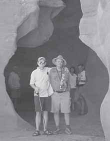 It is like walking through a cave with a narrow opening to the sky above. I had my doubts about the "tourist stuff," but this was worth the money despite the inevitable names that are given to rock shapes and the rituals having to do with sunrays and tossed handfuls of sand. We heard the story of the group of international tourists who were caught in the canyon by a flash flood. Our guide described their experience as "like being caught in a violent cement mixer, full of rocks and sand and water." None survived and the bodies that were recovered had been stripped of clothing. Apparently the canyon changes a good deal with every flood. The floor of sand may be several feet higher or lower depending on the force with which the water travels through. Trees carried by the water lodge in the convoluted sandstone of the walls. Everyone, including me, took pictures. Most of mine were either too dark or too light. One does show Chuck and Craig standing in the entrance to the slot.