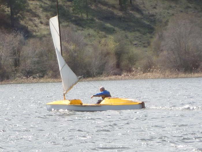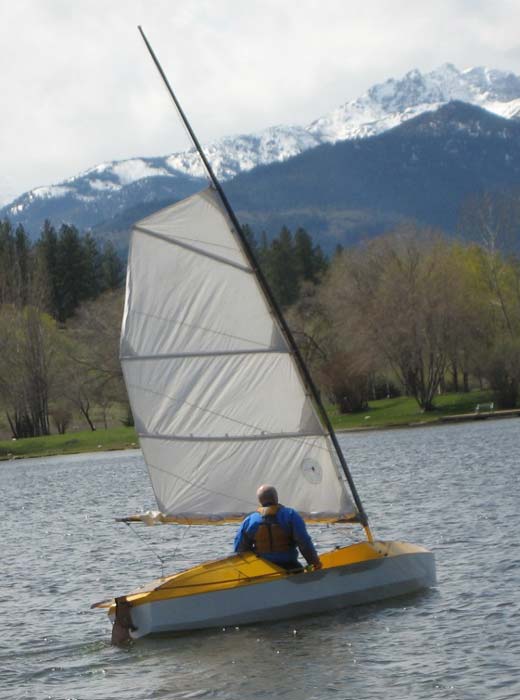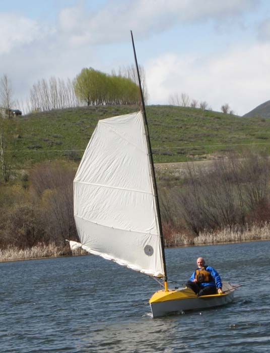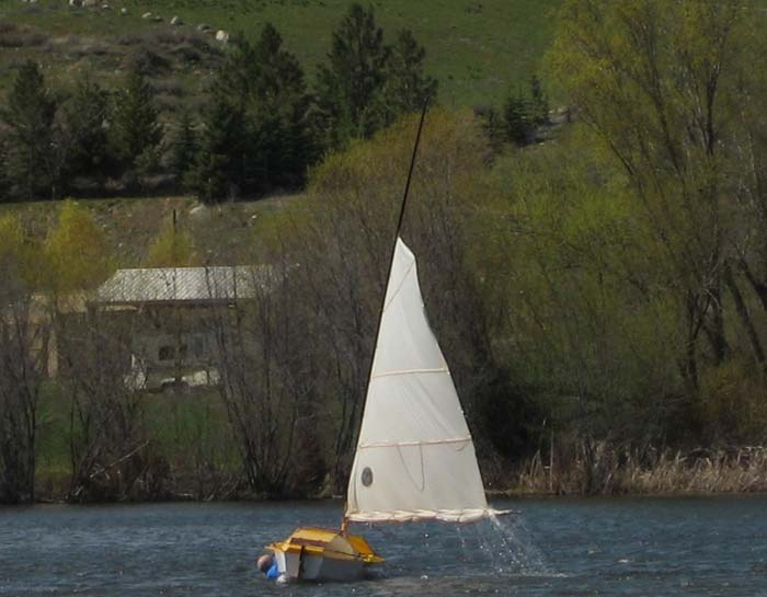 The wind was quite strong and very gusty. I rigged her with her new, larger sail and longer spars, but with one reef in. When I got out on the water it was very clear that trying it without a reef would NOT have been a good idea!