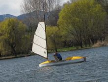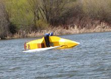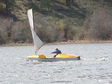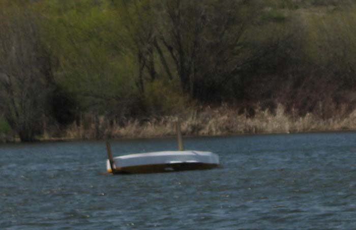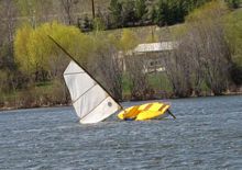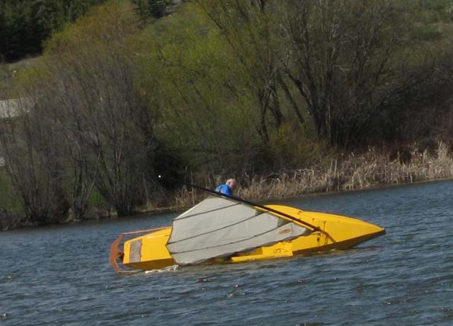 I immediately started sailing again, and within a few minutes, was hit by an unexpected gust and didn't make the right moves. Over we went again. This time, when I tried to climb over the high side, due to some combination of timing and wind, my weight was too far toward the sail, and forced her on over. In spite of foam in the mast she went completely upside down!