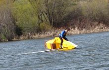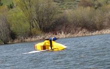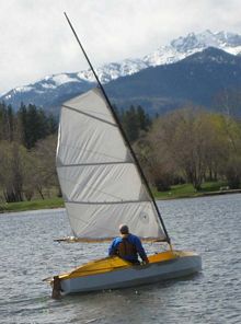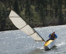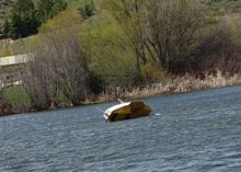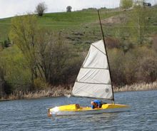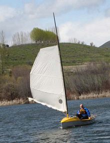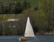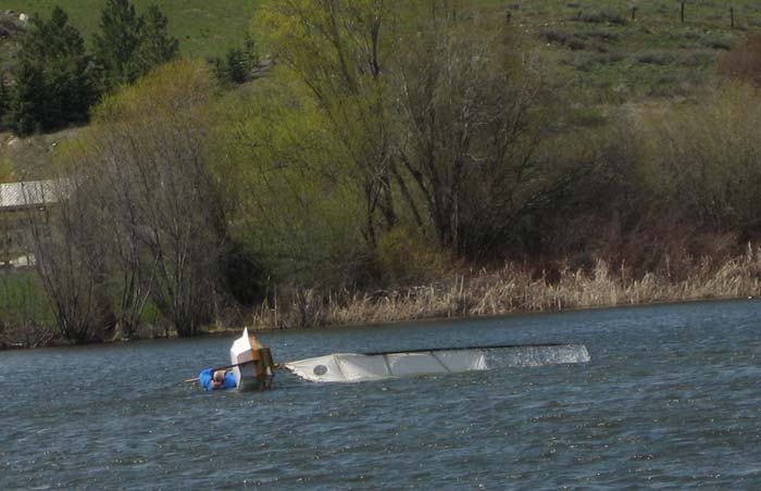 I hauled the Marsh Duck from Twisp to Pearrygin Lake behind my bicycle - 13 miles with headwinds and a few hundred feet of climb. I was quite tired by the time we got there. My friend Leona and I relaxed on the grass and had lunch. Then I put the Duck in the water and tried turning her over, empty and without rigging, just to get an idea of what would happen. When she was completely upside down, some water came in through the hatches - which was no surprise as they're not water tight.