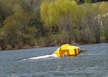 You can see from the pictures that she rides pretty high in the water when on her side. I think that the hatches stayed out of the water until she turned turtle. Since my hatches are not water tight, she did take on water when completely upside down, but only a few gallons.