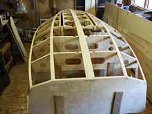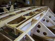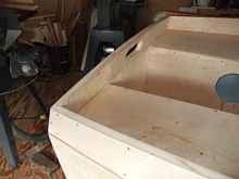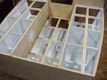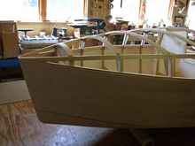The cases were constructed and glassed completely and installed at this time. At this point all the stringers were in place and planed to the shape to accept planking with 6mm plywood. The frames themselves were shaped for fair planking and all limber holes and reinforcements completed. I made sure that things that needed to be done were complete as it would be extremely difficult to do after the planking was on.