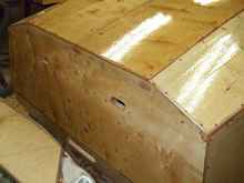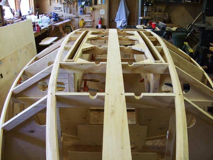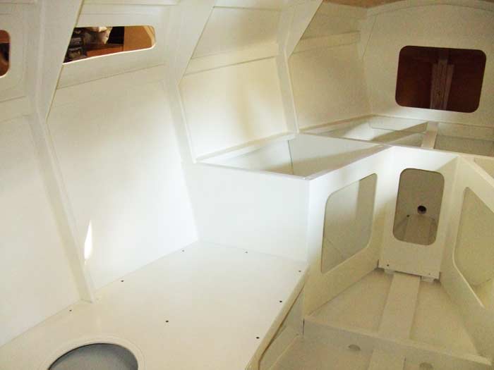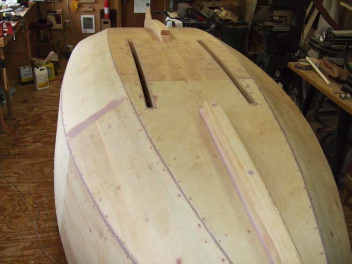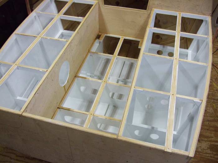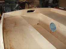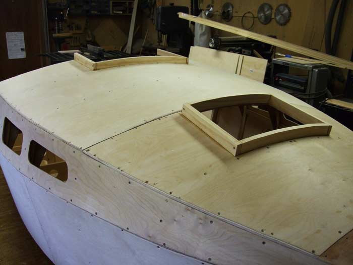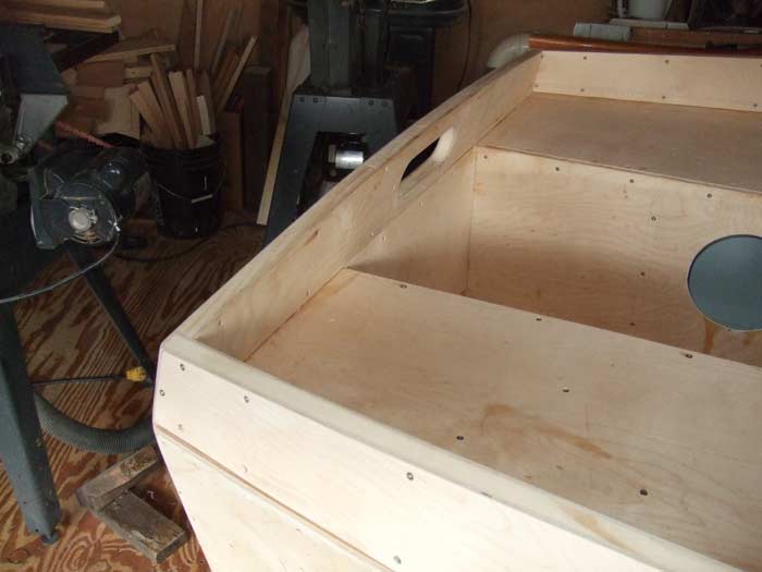 The cabin sides and deck-cabin top were now completed and the main and front hatches were framed in place. The design also showed a small anchor locker at the bow which was also completed. This locker would be sealed from the rest of the boat and would have drains overboard.