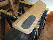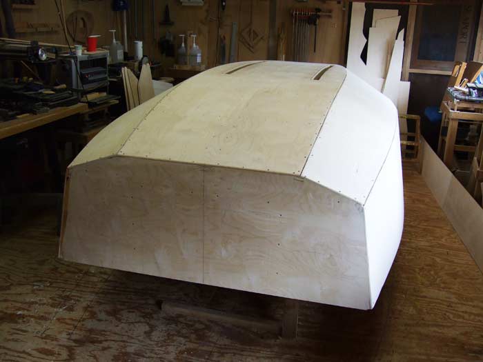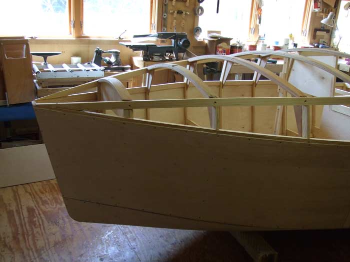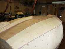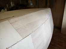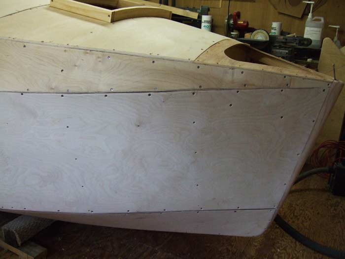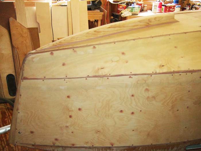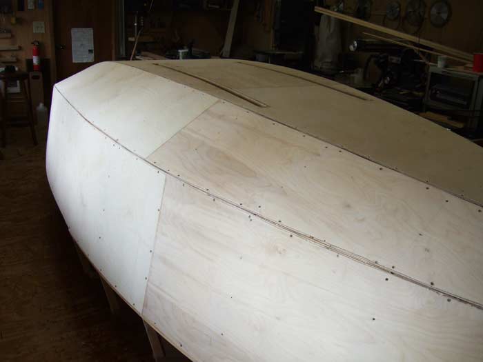 The time had now come to transform the complete skeletal frame into a boat by planking with 6mm plywood. The 4'x8' plywood panels were scarfed together to avoid using butt joints. All the planking was fastened using epoxy glue and stainless screws.