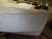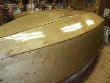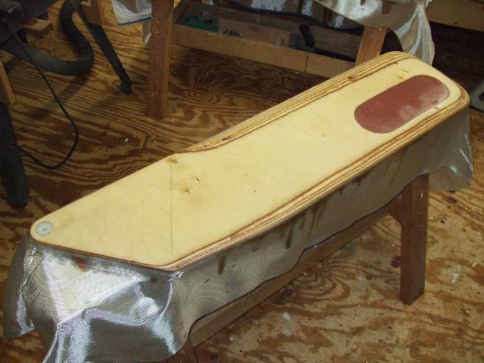 All the screw holes and gaps between the paneling were filled with epoxy filler. The edges and corners were rounded and the complete boat was sanded. The next step was the complete glass cloth covering of the entire boat with 10oz cloth and epoxy resin. The schedule was to have two layers on the bottom and one layer on all other surfaces. The epoxy resin was rolled on in at least four coatings.