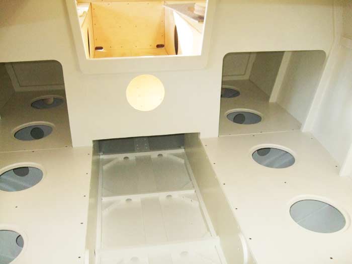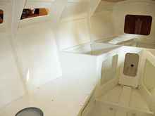 One unique feature of this design was that it was shown with two centerboards with each case forming the front of the bunks in the cabin design. This allowed better space in the cabin by not having the case in the middle of the cabin itself. It also allowed the opening in the top of the cases for lifting the boards to be used for cockpit drains in the self-bailing cockpit.