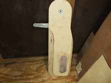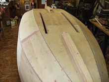 The design plans called for approximately 170lbs of lead ballast in the bilge inside the boat. I did not like this arrangement and decided to find a way to add the lead as outside ballast. The original design called for 2"x 2" skeg down the centerline of the boat. To accommodate the space needed for 170lbs of lead, I increased the skeg to 3"x 3" and left a gap in this skeg to allow for a casting of this weight. The front to back position was determined from the location of the designed inside ballast. The skeg was dramatically tapered forward and had small blade added to the after end.