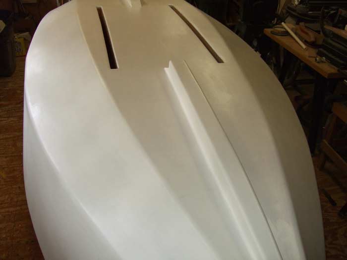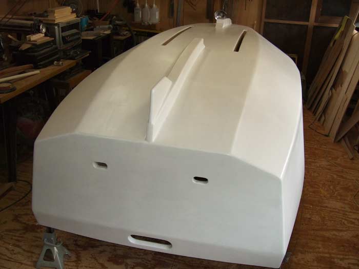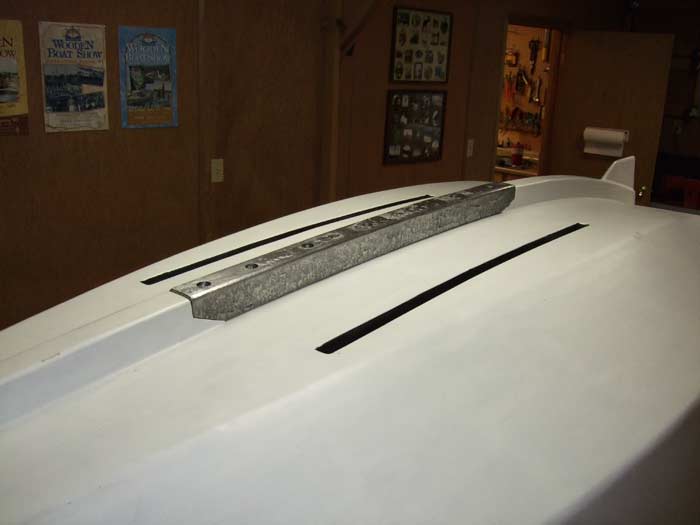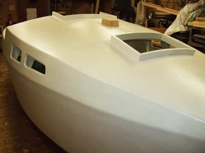 With the all the glassed and epoxied surfaces sanded, it was now ready for primer paint. Two coats of Brightside primer was now painted on and preparations made to move the boat from my shop area to the garage for all the finish work.