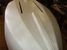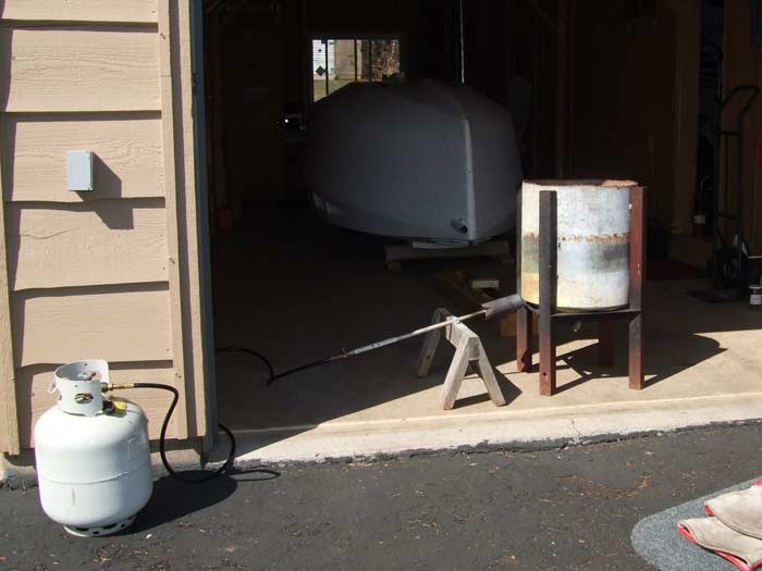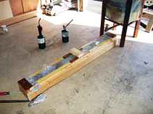 Casting the ballast is the next job to be done. The mold was constructed based upon a pattern made from the skeg area on the boat. This mold was coated with sodium-silicate to protect the wood from the heat of the molten lead. Cutting, shaping and drilling the lead casting was done with wood working tools, as lead is not that much different from dense wood. The slight curvature to conform to the hull shape was accomplished by laying the casting on a temporary shape and working it to shape with a good old fashion sledge hammer.