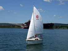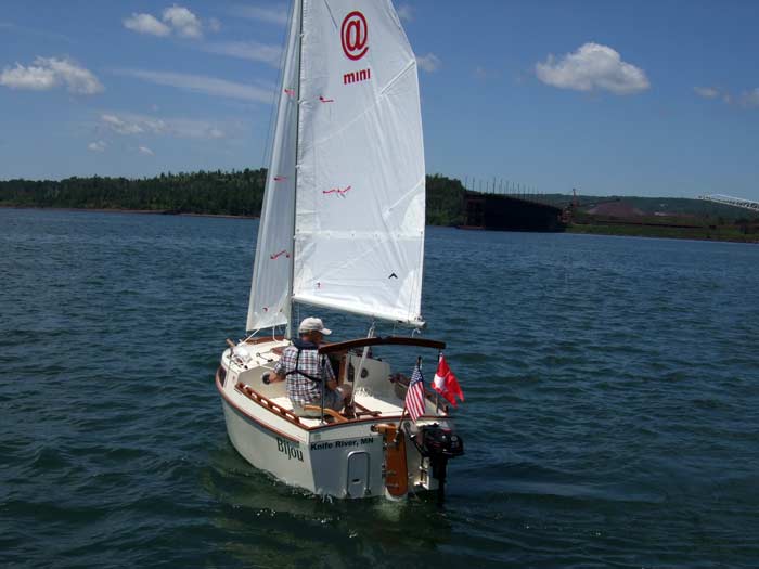 WOW, it really does sail. I think that it is interesting that on its first sail we have a 13ft boat alone in the harbor with an 800ft ore boat in the background at Two Harbors, Mn.