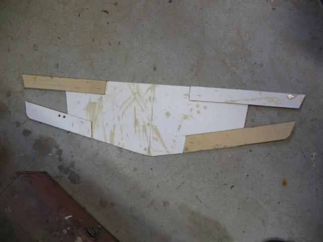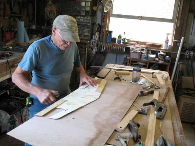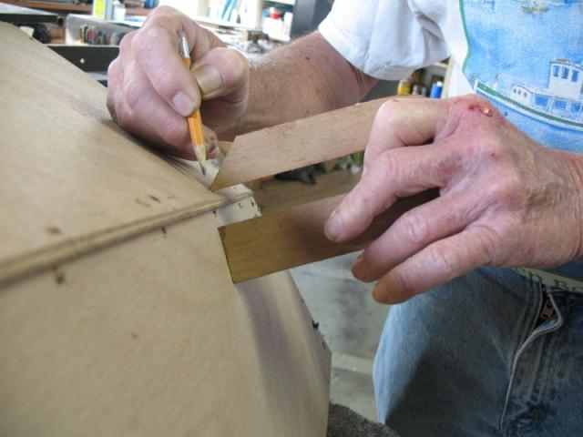I'm building a storage compartment in bow of dinghy, which isn't on plans, so every thing has to be built "in place". After much measuring, re-leveling, re squaring, etc, a pattern was made from heavy cardboard for the cross ways (thwartships) bulkhead. |