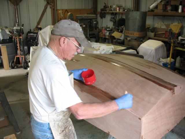 Pre-wet the areas that'll be taped. Note the keel was done first so there's no need to lean across wet epoxy. Obvious huh? See the apron? |