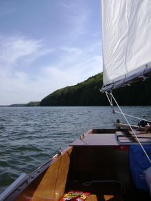 The winds were light most of the time but picked up just enough to let us get a taste of the fun we anticipate often in future planned trips. The boat seemed to handle well, even in my inexperienced hands. She bobbed over the wakes of massive cabin cruisers, barges and speeding powerboats that blasted by at 60 mph!