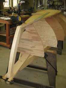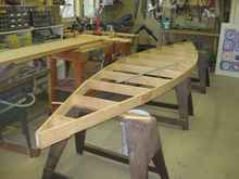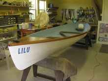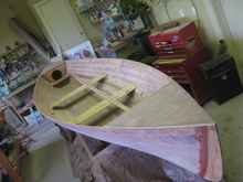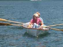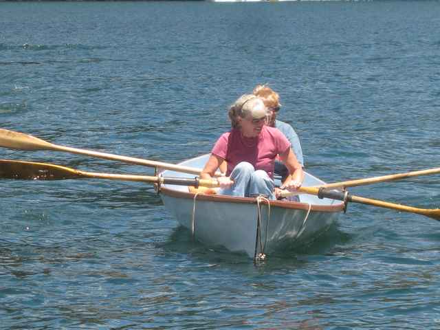 As the boat is double ended, I lofted only half to get station and bottom plank sizes. I added floatation tanks at each end with waterproof access hatches for safety and storage. The hull is covered inside and out with fiberglass set in epoxy and the resulting hull is quite stiff. If I were to do the boat over I would do lapstrake as I now know how to do it and like the looks. When we are up at the lake in the summer months I row the boat round Donner Lake every morning before the wind and power boats, wake boats, come out and chop up the water. The boat pounds going into powerboat wakes and needs a skeg if rowing in a crosswind. I think it would not pound in ocean waves or when loaded on its lines. It rows easy and carries well. I also added adjustable kayak foot braces to the rowing stations.