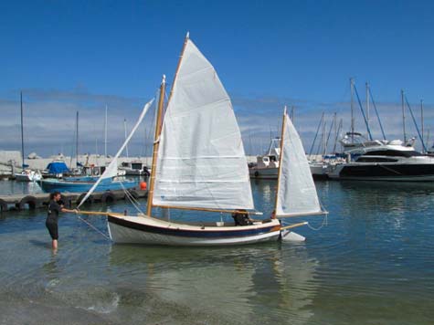 My first sail, with Steve and his wife Claudia, was out of Gordons Bay, a town on False Bay near Cape Town. False Bay is about 22 nautical miles across from Gordons Bay to Simons Town. We left the harbour under power of the little electric trawling motor. The power source is a 105 amp hour battery in a watertight compartment under the starboard thwart seat. The motor was modified by shortening the shaft so that the tiller can pass freely over the top of the motor. Although the motor does not have the thrust of a petrol outboard, it pushed us along at 5 knots and served it purpose, to get me from the trailer to the open sea and back on the trailer after the sail, just fine. To move along without any noise was a definite plus.