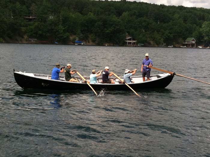Here it is is fully rigged, 15" & 16" foot oars stowed on the centerline, with the 17' and steering oars hung in the oar locks.