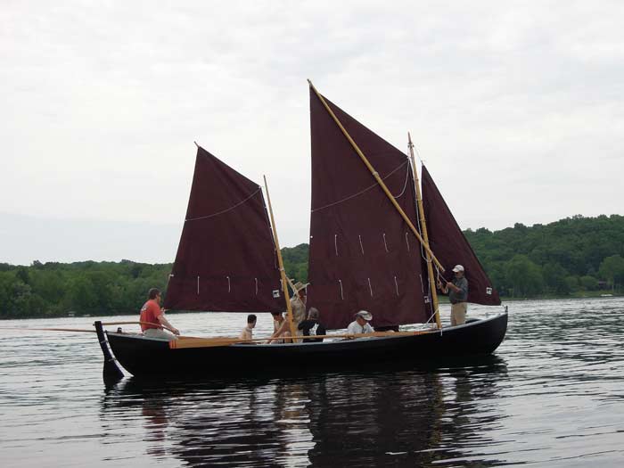 My son and I took two willing but inexperienced sailors with us in 20 kn winds a few weeks later. Running downwind from the launch at Tremain park under mizzen and jib, we reached the south end of the lake , and throwing caution literally to the wind, we deployed the main and turned into a beam reach, "cracking on to make all sneer". Within about 30 seconds we had carried away the peak outhaul cleat on the mainsail . So we struck the main and carried on with jib and mizzen, roaring across the 3 foot waves and reassuring the squeakers. No spray, no untoward or awkward behavior, just an exhilarating day on the water. The hull tracks well with little leeway (centerboard down) and the rudder is very light in the hand and turns the boat quickly. I don't have any photos of this, but lots of people took them from other boats; anyone out there have some to share?