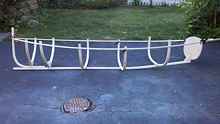 After a few initial broken pieces, I finally figured out the right recipe for the ribs. I ripped the 2x4s to 5/16 pieces, then I took a long downspout that was still around my garage from the last rain gutter job, and taped shut one of the ends, all water tight with duct tape. Then I raised the open end on a horse, and filled the down spout with water and soaked my pine strips in there for about 20 minutes. Of course, the wood does not want to stay under water and wants to shoot out, but capping the downspout with a rag stuffed hard in there will hold them down. I realized that I needed about 5 pieces laminated together to give me a sturdy rib, so I soaked all 5 pieces together and then I bent them all together to shape into their final form.