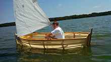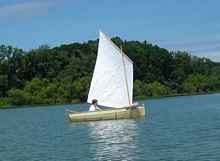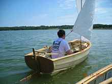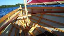 I have to say, that these are the most pretty 2x4s I have ever seen, not to mentioned how practical they are. After the sea trials, I have to say that it was a very good idea to drop the dead rise, because the boat sits on the water very nicely and is docile. However for the slightest breeze it easily ghosts along. For a sail I sewed up a three panel, broad seamed, boomless balanced lug, although I realized that it is even more practical to use it as a standing lug. The size of the mast is a bit too short only 10', so I am going to replace that with an 11' or a 12' sail, just to raise the foot of the sail a bit, but otherwise it sails very well with that 45 sq ft sail. I sailed this boat about three times, and enjoyed every moment of it, but I soon gave it away to my oldest son, who just loves it. Once in a while we go and sail together on nearby lakes and Lake Erie, I, with my transparent boat and him with his new Lawton tender. Over all, I think the boat has awesome lines and performs really well.