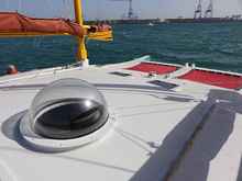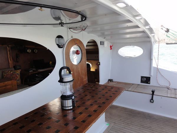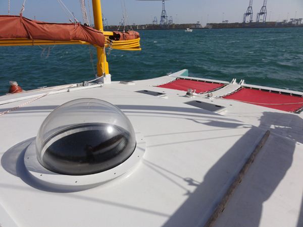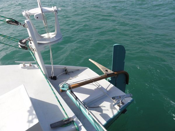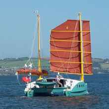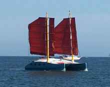 Sailing the boat as Atlantic proa. Watch the upper extension on the hull. I dit the same on our PELICAN. I Calculated the Pelican cannot capsize because of the added volume at this place on the hull. In the case of ORYX the wooden floating mast so far outside would/can help also.