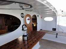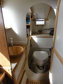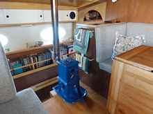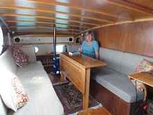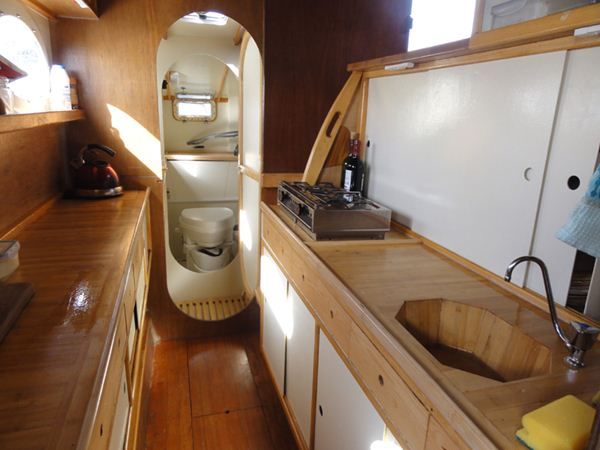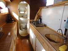 Kitchen looking aft. Observe wooden sink! Nice piece of workmanship