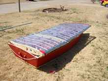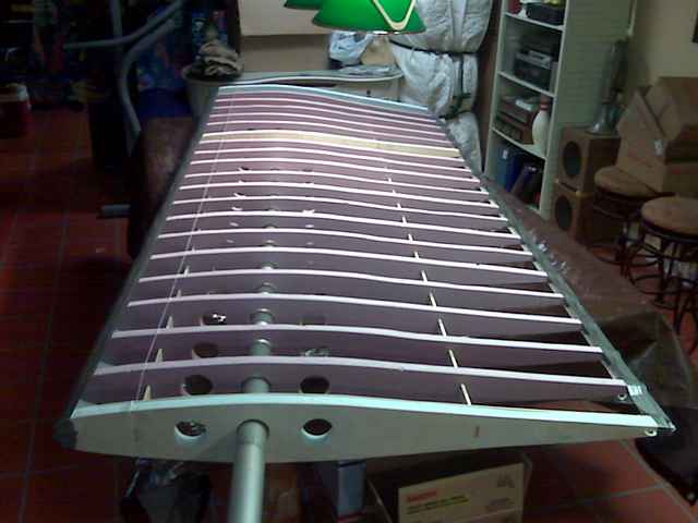 The build was half the fun. For starters, I chose the same airfoil most of us attempt to use on our rudders; the NACA 0012. I found the loft dimensions for the airfoil on-line, and scaled them onto a four foot long paper pattern. These were then transferred to a 4'x8' sheet of 1 inch construction foam insulation. Cost of the foam sheet was about $15. By overlapping the ribs front to back, there is easily enough material for 2 wing/sails. Even though I had access to a hot wire cutter, it was quicker and easier to cut out the ribs using a fine toothed saber-saw, then sanding with 100 grit paper. Foam is very easy to work with. The top and bottom ribs were skinned in 1/16" plywood (TB-III glue) for strength.