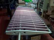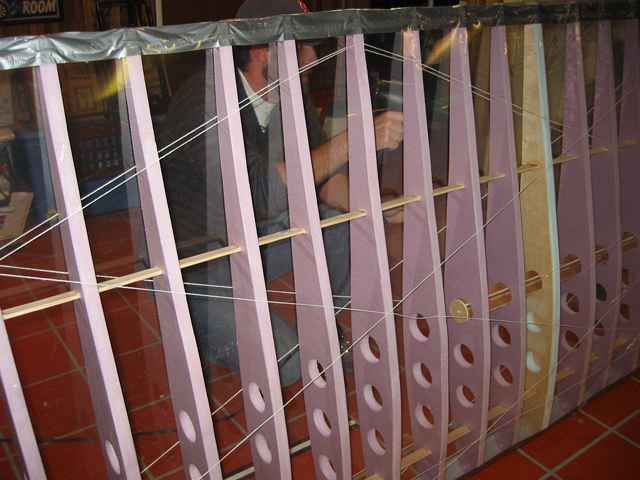 Twenty-four ribs were easily made in half a day. Slots were made in each for a pair of 1" x 0.25" x 10' pine stringers by drilling three 0.25" holes side by side, then cleaned up using a 10" mill bastard file. The ribs were then strung six inches apart and bonded with Gorilla glue. The location of the stringers isn't critical. In hindsight, the ribs could have been spaced a foot or more apart, allowing for a slightly lighter structure, and a faster build. A 1/16" plywood "X" shaped stub mast (main spar) supports the section above the aluminum mast in one of the alternate sets of mast holes.
