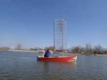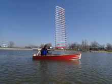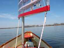 I finally found a decent 6-8 mph wind day on a 2,400 acre oxbow lake that is silting in at 4 feet deep (great waves though). After rowing out, I attached a sheet to both ends of the bottom rib for control. There is no conventional 'feel' to a wing sail, so the only way to point it is to watch a wind vane attached to the stub mast. The wind vane rocked with the boat and wasn't a lot of help. The wing also had a tendency to flop long its center of gravity if both sheets were not held firm. I haven't tried the mast in one of the alternate holes yet. But once pointed into a direction that moved the boat (speed measured by calendar, not GPS), some conventional handling pressure could be felt.