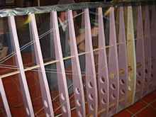 If I have lost you, just look at the pictures. It's far from rocket science. The leading (LE) and trailing (TE) edges are simply Duck TapeT ala Mythbusters. Try to keep the surfaces smooth. Three overlapping strips on the LE, and one on each side of the TE is enough. The covering material came from 2 large packages of 3M heat shrink window insulation film. That's another $15. It was attached to the four outer edges using 2" wide clear packing tape. I bought extra double sided tape to stick the film to every rib as well. (On Piper Cubs, the fabric covering is sewn to each rib.) The strings in the pictures mimic airplane drag/anti-drag wires. I was hoping to reduce any twist and assure that all the bits would stay together in a catastrophic failure. It wasn't worth the bother. The wing is now complete except for some spiffy colored and checkerboard tape, and number decals. Looking cool is 50% of the effort.