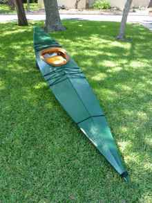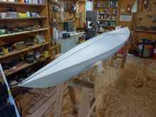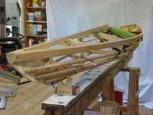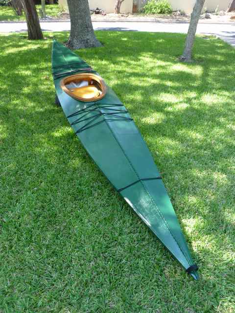 I recently built a skin-on-frame Sea Bee 13 kayak from Tom Yost’s plans (www.yostwerks.com). The build of this ‘fuselage frame” boat involves a simple strongback to which two notched plywood bow and stern cross sections are attached. Stringers (chines, keel, deck ridge, and gunwales) are attached to these, followed by more cross sections which are not attached to the strongback. After stem plates are attached at each end, and floors put in, skinning with nylon or polyester fabric follows. This is then covered with paint and/or other material. A cockpit coaming is attached after skinning. An upper visible coaming is supported by a lower half which is glued to the boat before skinning.
