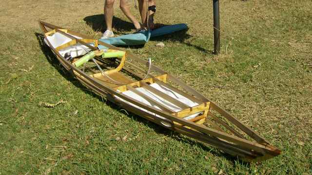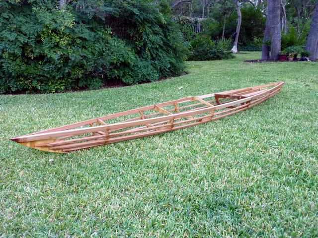 Construction was relatively simple and is well-detailed at the Yost website. I used half inch exterior plywood for the cross sections and Douglas Fir for the stringers. Glued dowels and some 40 lb. test Dacron fishing line secured the various stringers to the cross sections and end plates. Epoxy was used sparingly in various locations, supplemented by spar varnish to help make the cross sections more water resistant. Here is a shot of construction in progress and a second shot of the finished frame after being coated with Watco Danish oil.
