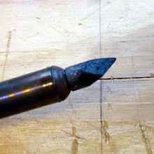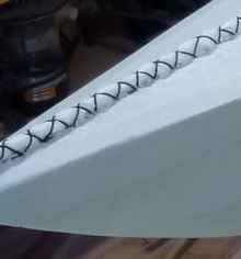 I stitched my 8 oz. polyester fabric (supplied by George Dyson) around the hull using advice from the Skinning with Polyester videos by Jeff Horton at www.kudzucraft.com. There is also help at the Yost-Skin-On-Frame-Boats Yahoo group. I cut/heat sealed the fabric edges using a small ‘chisel tip’ soldering pencil - inexpensive and more precise than a hot knife, though a bit slower to use.