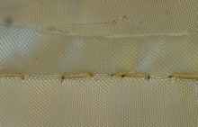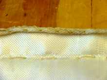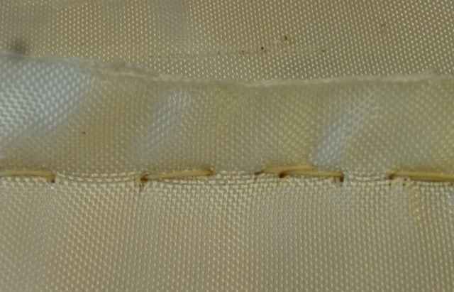 Starting at either side of the cockpit, I used tan-colored waxed polyester thread to do the initial running stitch to join the fabric snugly along the deck centerline, as Jeff Horton’s videos shows, then trimmed the fabric to a 1.5” width above this stitching. The first photo below shows this on a fabric sample. Rolling the 1.5” width fabric tight prior to whip stitching was difficult as the fabric slipped when being rolled. To remedy this I stitched some small diameter nylon line along the top edge of the fabric to start the roll (second photo), which made getting a tight roll somewhat easier.