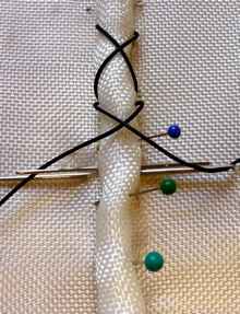 Initially the line passes through the fabric at the cockpit where the running stitch starts, with both halves of the line of equal length, and then the starboard line crosses to the port side and vice versa, each entering the fabric from the same position at opposite sides of the seam to complete the initial stitch. I spaced my stitches ¾” apart. After 15 or so stitches I tightened up each stitch sequentially and then held this stitched section tight using a hemostat before stitching another few inches toward the end of the boat.