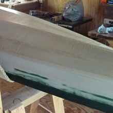 My first attempt at coating parts of the bottom with PL Premium was not successful, as I applied it too thick which led to excessive bubbles (some of which were over ½” in diameter). I bought more fabric and re-skinned the boat (guess I like sewing!); my second attempt at coating was more successful. I applied it as thin as I could with a plastic scraper that is generally used to help coat fiberglass with epoxy. I cut the scraper into two narrow pieces to have more control as I worked the PL Premium into the fabric. It took most of a tube for the amount of skin I coated. This process took about 90 minutes and occurred in 88 degree weather as I opened shop doors to allow cross ventilation which the tube said was needed for safety. I worked as fast as I could, applying very thin beads to areas of perhaps 15 to 25 square inches at a time before spreading it around and working it into the fabric.